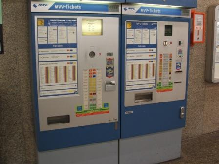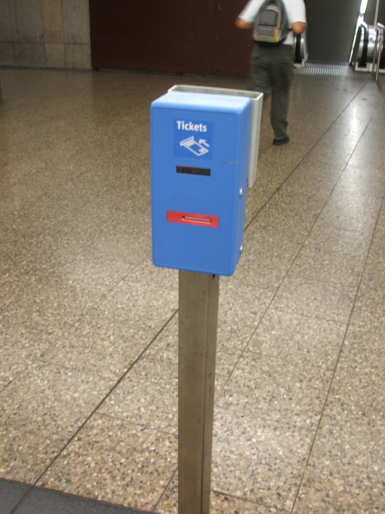 日本人にとって驚きなのは駅に改札が存在しないことである。各人が駅やバス内に設置されている券売機(左)で購入した切符を、同じく駅やバス内に設置されている自動刻印機(Entwerter、右下)に自発的に差し込むことで時間が刻印され、その時間から数えて有効期間内(普通の切符は2時間。一日乗車券などもある。)は自由に電車