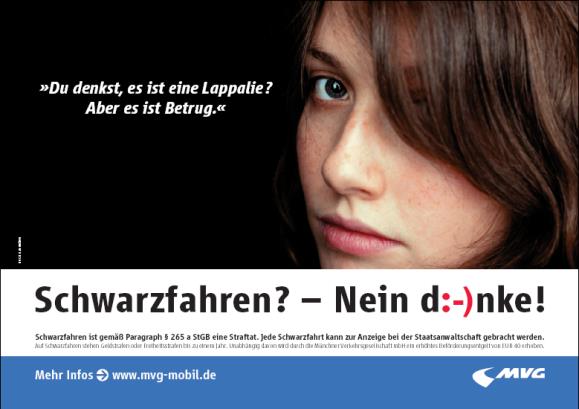 (左はMünchner VerkehrsGesellschaft(MVG、ミュンヘン交通公社)のシリーズ広告の一つ。「闇乗車?結構です!」とのタイトルが見える。)