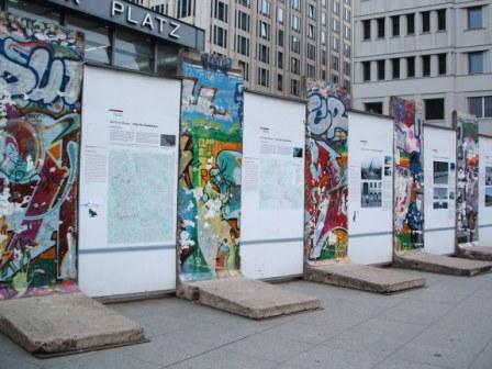 ベルリンにおける最も著名な建築物といえるブランデンブルク門は18世紀後半に建設された。プロイセン王家の栄光を象徴するこの門はベルリンの壁建設とともに東ベルリンの西端となり、同時にベルリンの壁をも象徴する存在となった。壁崩壊時にこの門を背景にして歓喜する市民の姿を記憶している人も多いだろう。ベルリンの壁自体は今はほぼきれいに取り除かれているが、統一後ビジネス街として急速に発展したポツダム広場などでは、解説板とともに壁の一部が残されている(右写真)。また東西ベルリン間の往来を管理していたチェックポイント(Checkpoint Charlie)は著名な観光スポットになっている。