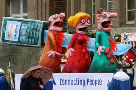 余談だが、2月上旬、世相を風刺した山車を出すことで有名なケルンのカーニバルでは、NOKIA携帯の形をした刃物に背後から串刺しにされた人形が練り歩いた。