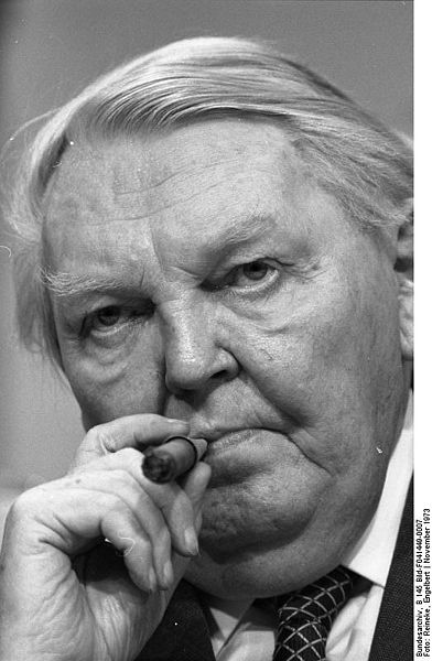 まず第一に、ドイツも他の大陸欧州の諸国家の例に違わず、今回の危機に際して基本的に「政府の市場への介入」という行為に対する本能的な躊躇というものがあまり感じられない、ということである。第二次大戦後のアデナウアー政権で長期にわたり経済大臣をつとめ、ドイツの戦後復興を軌道に乗せたルートヴィッヒ・エアハルト(Ludwig Wilhelm Erhard、のち連邦首相。右) という人物がいる。彼は日本で言えばさながら池田勇人といったイメージの人物だが、このエアハルトが提唱したとされる「社会的市場経済(Sozialmarktwirtschaft)」という経済概念が、現在に至るまでいわばドイツの経済政策上の国是として引き継がれてきている。内容自体は別段特殊なものではなく、市場万能主義と管理経済の中間を目指すという、現代の言葉で言うところの「第三の道」的な経済政策と考えてよい。ただ私の見る限り、「政府の市場介入は当然」という側面ばかりが独り歩きして、市場介入が自由市場の効率性をどれくらい侵害するのかを入念に検討するといった、デリケートな議論はあまりなされていない。