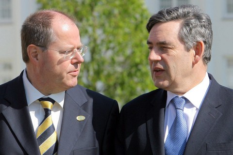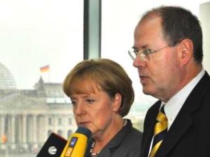 ともかくもドイツは今回の金融危機に対して最も早期かつ大胆に市場介入した国の一つである。10月はじめには「ドイツ国民の全預金の保証」を宣言し、翌週には準備額およそ4800億ユーロに上る金融機関救済法案を可決し、国民の不安の解消と危機の鎮静化に努めている。事情は大幅に異なるとは言え、日本政府が小泉政権の登場まで10年の長きにわたり思いきった金融機関への公的資金注入に踏み切れなかった事を考えると、経済政策上必要と判断すれば国民の税金を民間金融の救済のために質に入れることにも全く躊躇しない、ドイツ政府首脳の決断力と実行力には、目を見張るものがあると言わざるを得ない。(左は金融危機対策を発表するメルケル首相とシュタインブリュック(Steinbrück)財務大臣。)